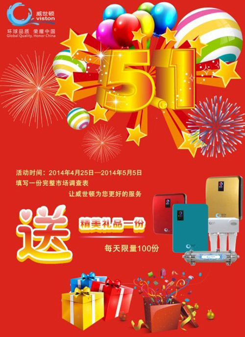 五一是劳动者的节日,威世顿为广大消费者精心推荐数款家用净水机精品,并打出超低价格,让更多的消费者受惠,真正物超所值。