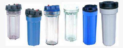 常见的家用滤芯式过滤器一般为下图所示的样子,主要由一只塑料滤壳、顶盖及滤芯组成。接口一般有4分(1/2")或6分(3/4")两种,根据所装滤芯的长度,可以分为10"或20"等规格。建议根据自己的安装条件来选择,在可能的情况下,选择大一些的更好些,可以提供更大的容量。其安装也较为简单,直接接好进出水管即可。滤芯有一定的使用寿命,需要根据实际情况及时更换(原滤芯一般可以进行少数几次的简单冲洗,其后应予以抛弃)。