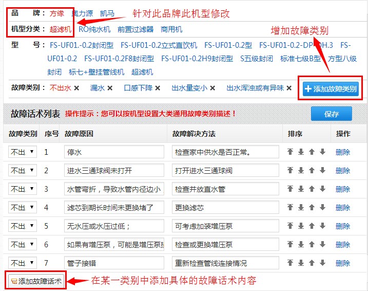 如下图,当选择某一品牌的某一机型分类后,不选择型号,此时是对此分类故障话术进行增删改。此时修改的故障类别以及具体的故障话术内容,都默认适用此品牌的机型分类下的所有型号的机器。也就是说,此时添加的是此种机型的通用故障话术。以下图为例,此时修改的故障话术,适用方缘品牌下的所有超滤机,只要是此类机型,在预约时,选择维修,那么可以看到这里设置的所有故障话术内容。提示:添加完内容后,记得点击“保存”。