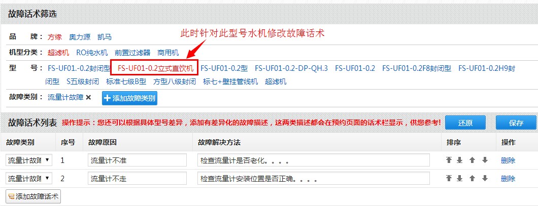 如下图,当选择某一具体型号的水机后,此时是对此型号水机故障话术进行增删改。此时修改的故障类别以及具体的故障话术内容,都只适用此型号水机。也就是说,此时添加的是此型号水机的特有故障话术。以下图为例,此时修改的故障话术,仅适用方缘超滤机下的FS-UF01-0.2立式直饮机,只要是此型号水机,在预约时,选择维修,那么可以看到这里设置的所有故障话术内容,而其他型号产品则看不到这里设置的故障话术内容。