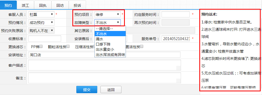 设置完以上内容,就可以去服务流程里面使用了。如下图,在“派工流程管理”的“预约”标签页里选择“维修”,此时故障类型就会根据此客户购买的水机机型和型号,自动显示其应有的故障类型。选择某一故障类型,右边预约话术栏就会显示此水机在这类故障中会出现的问题和解决办法。