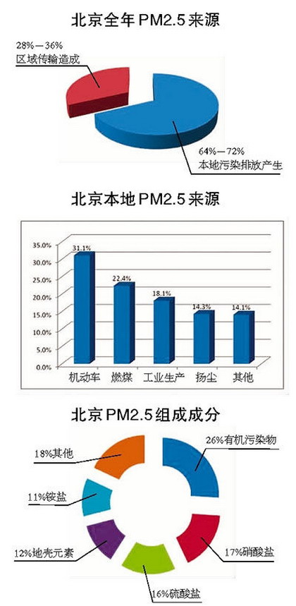 北京最新的分析结果显示,在北京本地PM2.5污染中,机动车、燃煤、工业生产、扬尘为主要来源。机动车占31.1%,燃煤占22.4%,工业生产占18.1%,扬尘占14.3%,餐饮、汽车修理、畜禽养殖、建筑涂装等其他排放约占14.1%。这其中,机动车对PM2.5的贡献是综合性的,既包括直接排放的PM2.5及其气态前体物,也包括间接排放的道路交通扬尘等。