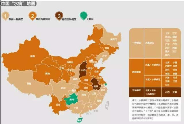 国家卫计委在2014年向国务院报送的《全国地方病防治“十二五”规划中期执行情况报告》显示,饮水型氟中毒、饮水型砷中毒、水源性高碘甲状腺肿三大水病的防治均取得积极进展,其中饮水型氟中毒治理的受益人口已达6600多万。