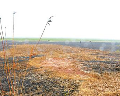 就在挖出暗管的附近,是一大片绿色的芦苇地。中间一块将近五六亩的土地上,却没有芦苇生长。地面上一片焚烧过的黑色遗迹。边上的一片地面还留有暗红色的印迹,明显是水流过后的印迹,离近了还能闻到刺鼻的气味。